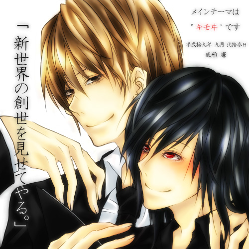原寸大版です(´∀`)……そろそろ500x500は止めた方が良いですか?重い??wwww でもこれが一番描きやすいサイズなので許してください、どうしても嫌だと言うのならやめますが(何) というわけで、新世界を見せてやるなネ申と素敵ですネ申!の盲目コンビです 二人の為に世界はありまs きっと彼らの目には輝かしい新世界という名の未来予想図が見えていることでしょう ええ、きもいですね^^ とりあえずIfとでも思ってくれれば幸いです。もしも月があそこで勝利していたら~とかね(´∀`) ありえない、なんてことはありえないwww誰かが言っていた言葉です(作品違 まあ人々がどんだけ阿鼻叫喚しててもきっと月は照にとっては永遠に神様なのです。私のネ申!!! そんでもって月も照と一緒に過ごしてるうちに何だか手放すのが惜しくなってくると良い(人はそれを愛しさと呼ぶ 何でも完璧にこなせると思ってた照が自分の前でだけ微妙にドジっこになるのに萌えれば良いよ!! こいつらって本当に盲目でしょうねー。 お互い好きになったら多分周りなんて見えなくなるんだろうなあ……www …………もうお前らほんと結婚しちゃえYO!!! 2007.09.20 Thu 09:29:26